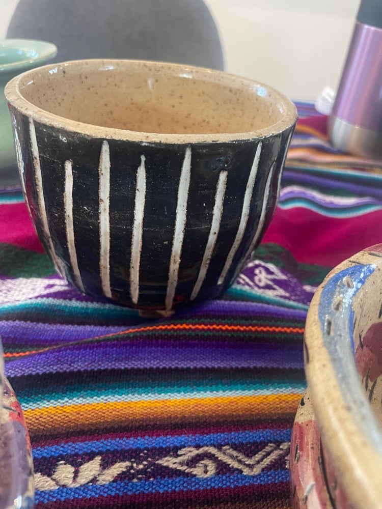 Flower pot with draining hole. Black with white stripes. Great for any green plant.